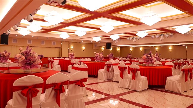 皇宮廳—金碧輝煌、皇宮式裝修,面積1038㎡,層高8.6米,配備愛情階梯、軌道威亞、二層觀禮臺、浪漫燈光秀、旋轉升降舞臺、頭頂天幕連接開合大屏??沙薪?0桌的大型宴會,也可舉辦600人的大型會議;還可用作會展、車展場地,每逢節假日還為市民上演文藝節目。